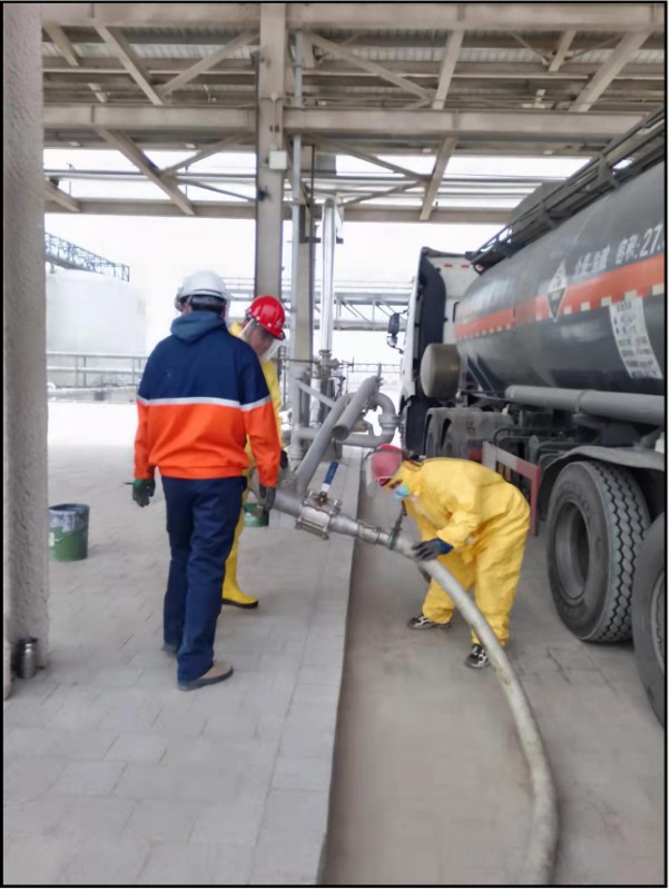 正式作业前,项目各班组人员对汽车输送泵、碱液罐区气动调节阀等进行检测试验,对工艺流程中法兰、管道等进行周密检查,多次确认。各专业人员紧密配合,协同工作,为碱液顺利进料做好充分准备工作。随着装满碱液的罐车缓缓驶入物流园货场装卸栈台,班组各岗位人员认真落实安全措施,严格按照操作流程进行进料作业,碱液储罐顺利完成首次进料。