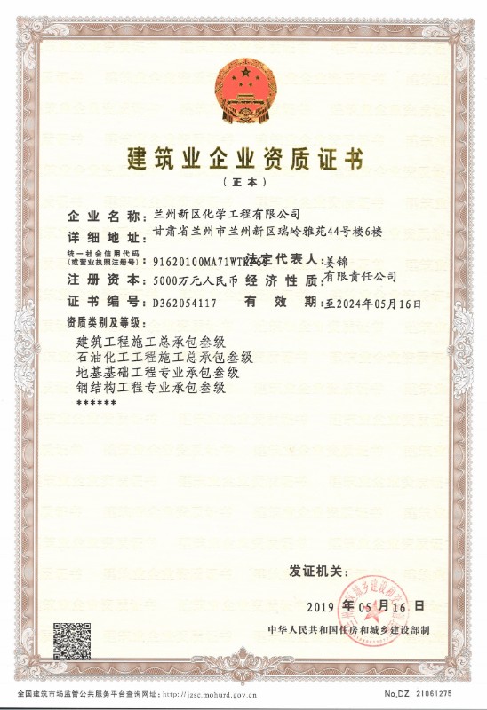 兰州新区化学工程有限公司目前已取得了石油化工总承包三级、建筑工程总承包三级、钢结构专业承包三级、地基处理专项承包三级资质。