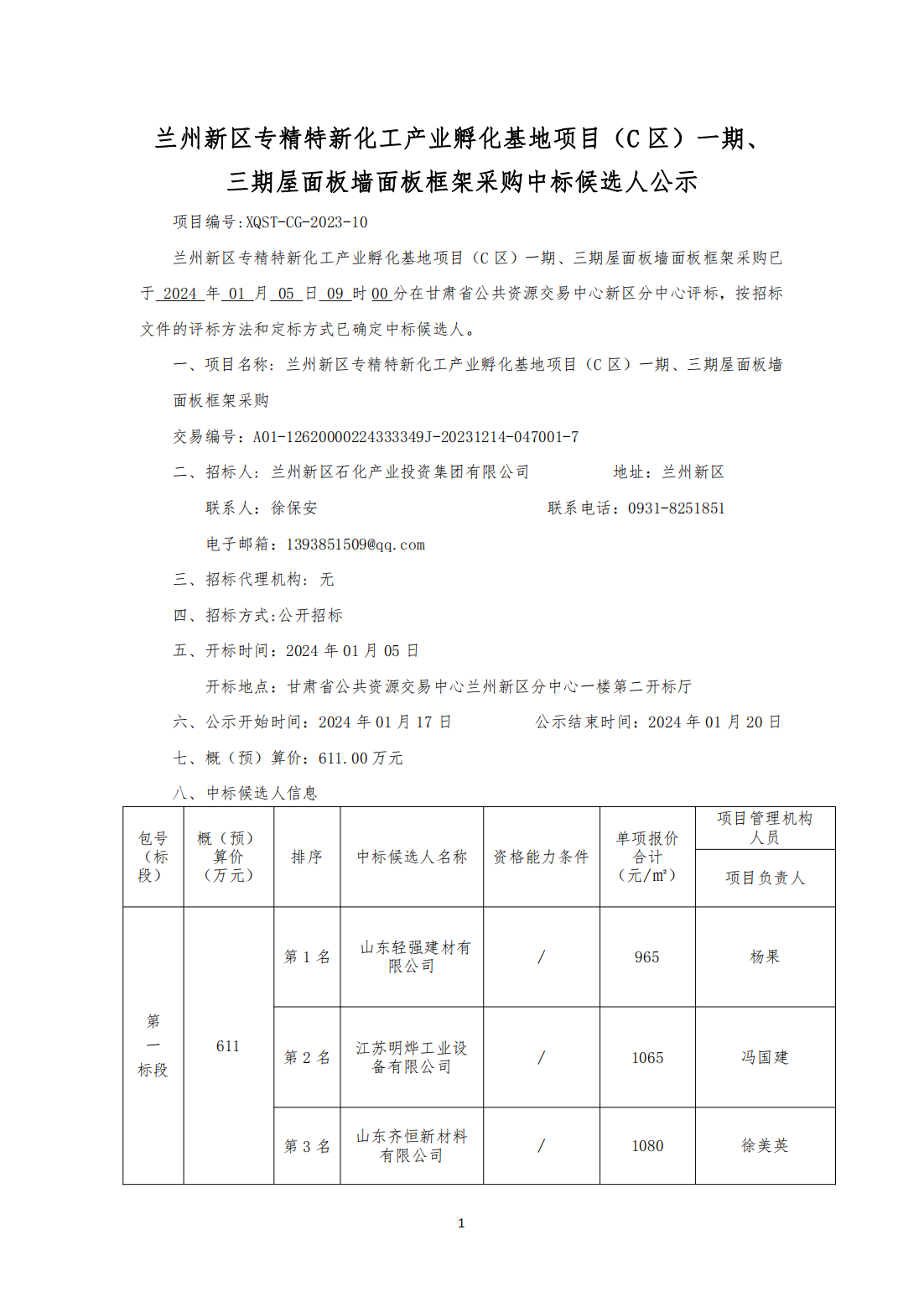 兰州新区专精特新化工产业孵化基地项目(C 区)一期、 三期屋面板墙面板框架采购中标候选人公示
