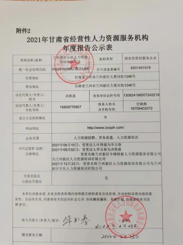 根据甘肃省人力资源和社会保障厅《关于开展2021年度全省经营性人力资源服务机构年度报告公示工作的通知》(甘人社通〔2022〕44号)文件要求,现对兰州新区石化人力资源培训有限公司2021年度报告进行公示,接受社会监督。详见年度报告公示表。